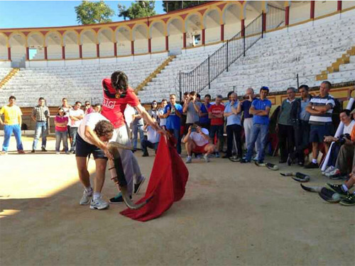 Y al día siguiente, los alumnos entrenaron con el equipo de profesionales a través de una dinámica con distintos profesores y grupos. Así, colaboraron durante la mañana el novillero Ginés Marín y el banderillero Javier Valdeoro, de la cuadrilla de Antonio Ferrera, en una clase magistral de lidia con el capote.