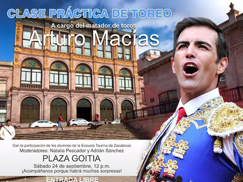 El matador Arturo Macías será el encargado de cerrar el Ciclo Cultural de la Feria de Zacatecas este sábado 24 de septiembre, con una clase de toreo que tendrá lugar en la Plazuela Goitia, enclavada en pleno centro histórico de la ciudad, misma que será a partir de las 12:00 horas.