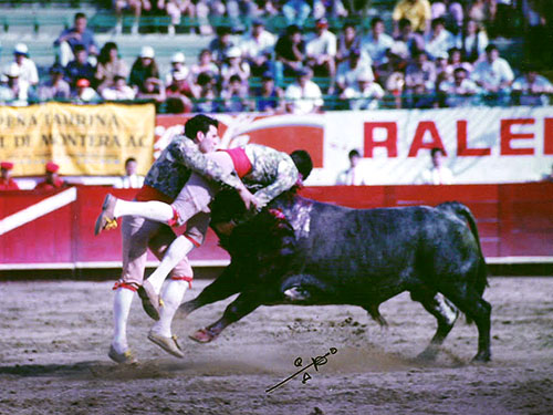 En esa ocasión tocó turno a Pedro Ortiz, una de las figuras de entonces, que realizó una excelente pega al primer intento, a un toro de Zotoluca que pesó 530 kilos que había sido lidiado por el rejoneador Paco Barona, según se aprecia en la imagen que ilustra esta nota. En aquella época el cabo del grupo era Gerardo del Villar, que también fue una pieza clave en el desarrollo de los Forcados Mexicanos.