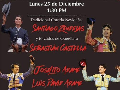 La empresa "Pal´ Toro", que dirige Pablo Álvarez “Palillo” ha cerrado el cartel de la tradicional Corrida Navideña a celebrarse en la plaza de toros "Santa María", de Querétaro, festejo que se llevará a cabo el lunes 25 de diciembre a las 16:30 horas.