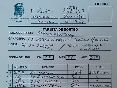 Fueron sorteados los ejemplares de las divisas de José Ma. Arturo Huerta y de Marco Garfias, que serán lidiados en la plaza “Monumental” durante la corrida de la Oreja de Oro, misma que por segundo año consecutivo presenta un formato de tercia.