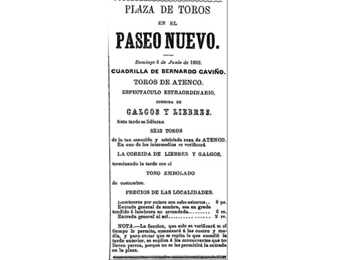 Esta actuación, una más de las 725 registradas entre 1829 (o 1835) y 1886 en nuestro país, incluyendo Uruguay, Cuba, Perú y Venezuela, posee elementos de fascinación sólo explicables a la luz de todos aquellos componentes que permitieron –en este caso-, la construcción de un “espectáculo extraordinario”, el cual incluyó la presencia de “galgos y liebres”, así como el “toro embolado”, sin faltar la curiosa advertencia aparecida al final del cartel y que apuntaba con cierto humor involuntario: “La función, que solo se verificará si el tiempo lo permite, comenzará a las cuatro y media, y para evitar que se repita lo que sucedió la tarde anterior, se suplica a los concurrentes que no lleven perros, porque no se les permitirá la entrada en la plaza”.