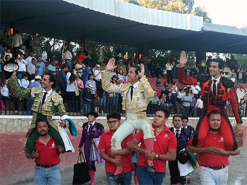 Los matadores Alfredo Ríos "El Conde", Juan Antonio Adame y José Mauricio, compartieron la salida en volandas tras regalar una tarde triunfal en la tradicional corrida de feria en San Luis de la Paz, Guanajuato, y repartirse un amplio número de orejas.