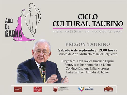 El comité organizador del Ciclo Cultural Taurino de la Feria de Zacatecas, se complace en invitar al Pregón Taurino en el que participará el ingeniero don Javier Jiménez Espriú, este próximo sábado 6 de septiembre, a las 19:00 horas, en el Auditorio del Museo de Arte Abstracto Manuel Felguérez.