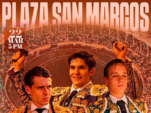 Se ha conformado el primer cartel de triunfadores de la temporada de novilladas en la plaza "San Marcos", donde el próximo domingo 22 de marzo actuarán César Fernández "El Quitos", Jairo López y Axel López, tercia que despachará un encierro de seis novillos de La Playa, propiedad de la familia Quijano.