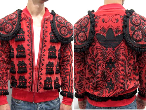 La reconocida marca Adidas ha diseñado un curioso atuendo inspirado en la chaquetilla del vestido de torear, denominado como "Originals JS Torero Superstar Track Top", que consiste en una prenda de color grana, bordada con hilo negro, que tiene hombreras, alamares y pedrería.