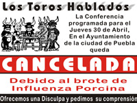 La última de las conferencia del ciclo "Los Toros Hablados" celebradas en la ciudad de Puebla en un salón del Ayuntamiento, ha sido cancelada debido al brote de Inluenza Porcina que continúa afectando al país.