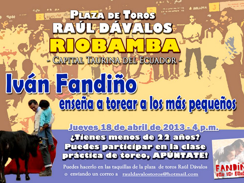 A esta iniciativa que comenzó con una clase práctica del maestro Julián López "El Juli" en una plaza de Andalucía y Pamplona se han sumado las de otros toreros como Manuel Jesús "El Cid" o Miguel Ángel Perera en España, o Mari Paz Vega en México. Y ahora toca turno a Iván Fandiño, que hará lo propio en la plaza de toros "Raúl Dávalos" de Riobamba, Ecuador, que en este mes de abril celebra sus corridas de feria.