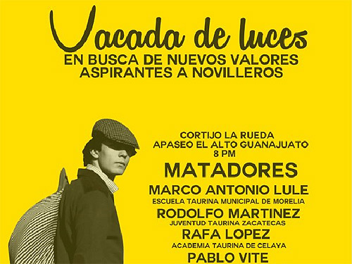 En el cartel aparecen los nombres de Marco Antonio Lule (Escuela Taurina Municipal de Morelia), Rodolfo Martínez (Juventud Taurina Zacatecas), Rafael López (Academia Taurina de Celaya), Pablo Vite (Escuela Taurina Hidalguense) y Bernardo Rodríguez (Academia Municipal de Aguascalientes). Se lidiarán cinco vacas de Celia Barbabosa.