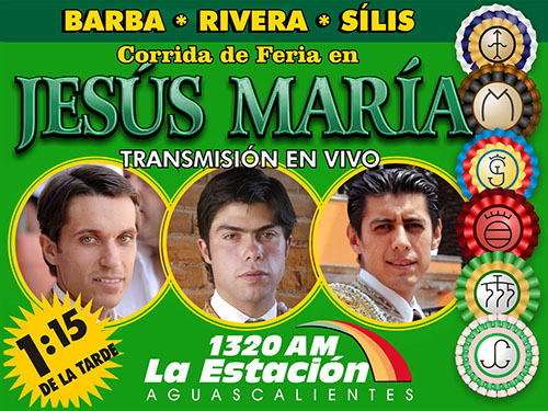 En punto de las 13:15 horas será trasmitida por radio la corrida de feria en Jesús María, Aguascalientes, hoy domingo, a través de las frecuencias hidrocálidas La Estación (1320 AM) y Alternativa (92.7 FM). Nuevamente la transmisión está a cargo de nuestro corresponsal Adrián Sánchez, acompañado de Alejandro Hernández y Edgar Herrera.