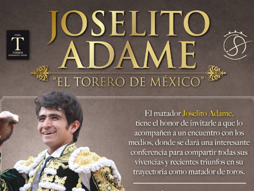 El matador hidrocálido Joselito Adame estará esta noche en la Universidad Panamericana, campus Guadalajara, donde tendrá un encuentro con los medios y ofrecerá una conferencia en el auditorio de esta institución de estudios superiores de la capital jalisciense.