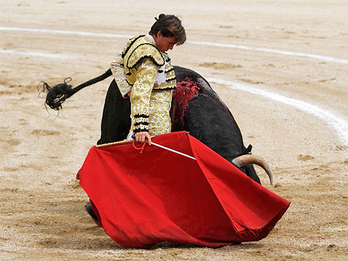 Otro tanto le ocurrió con el quinto, que fue tan soso como una actuación que estuvo plagada de dudas. A la hora de entrar a matar quiso echar mano del recurso de la espada y se enfrontiló, sufriendo un fuerte golpe a la altura de la ingle derecha, afortunadamente sin consecuencias aparentes que lamentar.