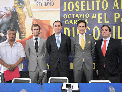 El presidente municipal acompañado de dos de los toreros del cartel y el empresario