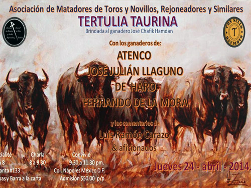 La tertulia será en homenaje a Pepe Chafik, fallecido recientemente, y en la mesa tomarán parte los ganaderos de Atenco, José Julián Llaguno, De Haro y Fernando de la Mora, con la moderación y comentarios del periodista Luis Ramón Carazo.
