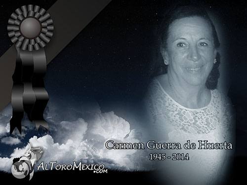 En la mañana de ayer jueves, en la sala de terapia intensiva del Centro Hospitalario MAC, al sur de la ciudad de Aguascalientes, a la edad de sesenta y nueve años, dejó de existir la señora Carmen Guerra Morales, esposa de Claudio Huerta de la Torre, propietario de la ganadería del mismo nombre y madre de Claudio Huerta Guerra, directivo de la escuela taurina de Espectáculos Taurinos de México. La señora de Huerta no resistió las graves lesiones sufridas la semana pasada, en el accidente carretero en el que participó el automóvil conducido por el ganadero, cuando se encontró de frente con otro vehículo, cuyo operador imprudentemente rebasó sin precaución colisionando de frente con el auto de los Huerta.