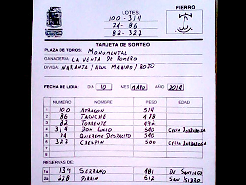 Los toros de la ganadería de La Venta de Romero, propiedad de Salvador Gómez, fueron sorteados hace unos minutos en el patio de caballos de la Monumental de Aguascalientes, y a continuación les presentamos sus características y orden de salida, así como de los dos remiendos de Celia Barbabosa que se jugarán en cuarto y sexto lugares, respectivamente.