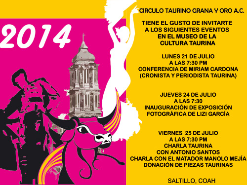 Celebrando un aniversario más de la fundación de la ciudad, los eventos se inauguran en el Museo de Cultura Taurina de Saltillo, situado en la esquina de las calles de Xicotencatl y Rámos Arizpe, el próximo lunes 21 del presente