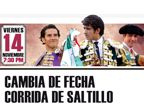 Mediante un comunicado de prensa, Casa Toreros, que organiza la corrida de Saltillo en compañía de Casa Guadiana, informa que la celebración de este festejo será aplazado al viernes 14 de noviembre a las 19:30 horas y con el mismo cartel, según se explica en las siguientes líneas:
