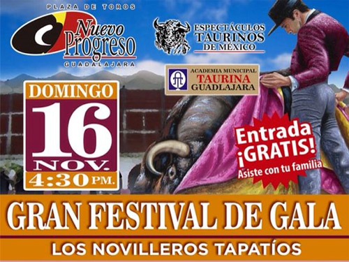 La empresa de la plaza "Nuevo Progreso", en conjunto con la Academia Taurina Municipal de Guadalajara, anuncia la celebración de un festival novilleril para el próximo domingo 16 de noviembre, a las 16:30 horas, integrado con la participación de seis espadas.