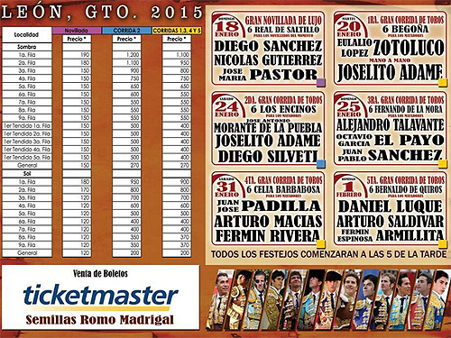 La empresa la empresa Espectáculos Taurinos de México informa que, a partir de ayer viernes, se han puesto a la venta los boletos para el Serial Taurino León 2015, conformado por cinco corridas de toros y una novillada, a celebrarse entre el 18 de enero y el 1 de febrero.