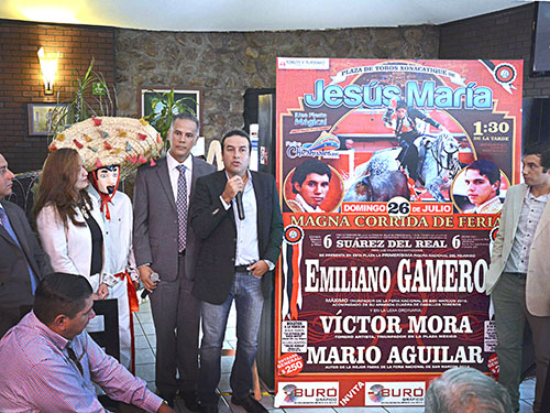 La conferencia de prensa tuvo lugar en un restaurante del norte de la ciudad en el que el Arámbula, acompañado de otros funcionarios de su gabinete, y del matador Jorge Mora, gestor del evento, anunciaron que actuarán el rejoneador Emiliano Gamero, Víctor Mora y Mario Aguilar, con toros de la ganadería zacatecana de Suárez del Real.
