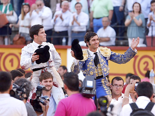 Morante de la Puebla y el joven espada José Garrido, compartieron la puerta grande de la plaza de Badajoz al finalizar la corrida celebrada hoy, en la José Mari Manzanares cortó una oreja, y donde se lidió un encierro de la ganadería de Zalduendo que dio buen juego.