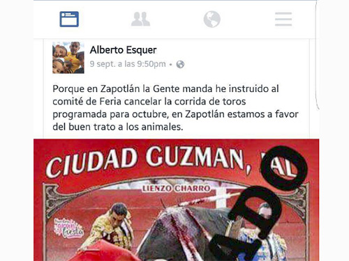En este aviso en redes sociales, Esquer Gutiérrez afirma que "en Zapotlán El Grande la gente manda, e he instruido l Comité de Feria cancelar la corrida de toros programada para octubre porque estamos a favor del buen trato a los animales".