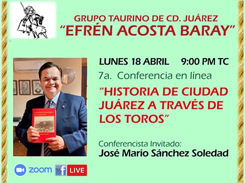 El Grupo Taurino de Ciudad Juárez "Efrén Acosta Baray", ya tiene listo lo que será su séptimo encuentro de difusión cultural, el cual está programado para el lunes 18 de abril con el tema "Historia de Ciudad Juárez a través de los toros", ponencia que estará a cargo de