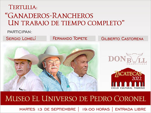 El Ciclo Cultural de la Feria de Zacatecas continúa con sus actividades, y este martes 13 de septiembre, a partir de las 19:00 horas, tiene programada la tertulia titulada: "Ganaderos-rancheros, un trabajo de tiempo completo", que pretende ilustrar sobre distintos aspectos prácticos en el manejo del ganado de lidia y la dificultad que conlleva su crianza.