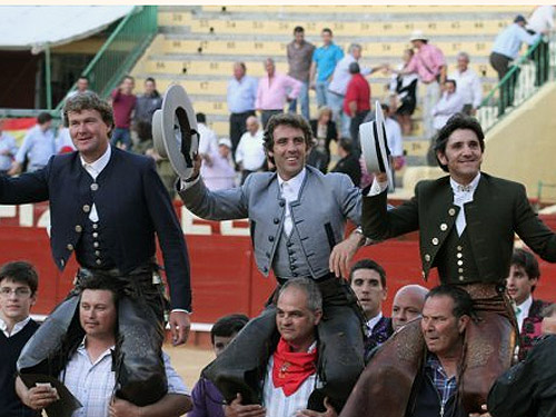 Fermín Bohórquez, Pablo Hermoso de Mendoza y Diego Ventura, han salido en hombros de la plaza de toros de Jerez, junto al ganadero, tras cortar dos, cuatro y tres orejas respectivamente en el primer festejo de la Feria del Caballo, en Jerez