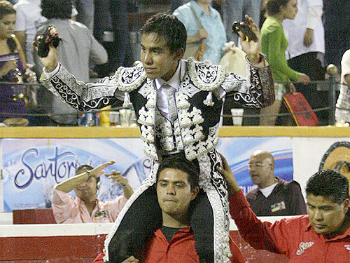 El primer espada, Alfonso Mateos, estuvo muy bien con el que abrió plaza, pronto fue al caballo el de Ajuluapan y en el quite hubo chicuelinas con ritmo. Muleta en mano, Mateos trazó ayudados de gran temple y naturales con sabor, siempre tratando de realizar su labor en los medios, pese a que el novillo acusaba ya tendencia a los tableros; con decisión colocó un espadazo fulminante que hizo rodar para llevarse una merecida oreja.