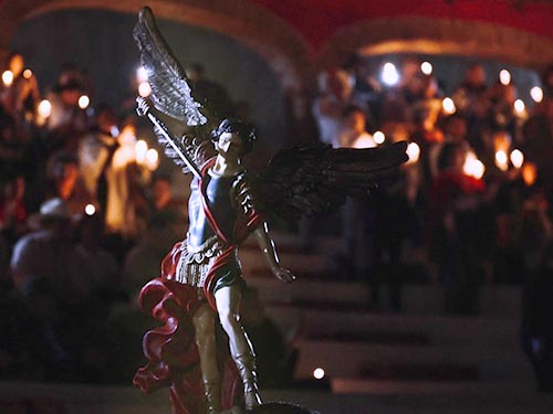 La gente no había visto esto y les causó sensación. La plaza se llenó, se apagaron las luces y se encendieron las velas. Se tuvo la participación de una soprano Dulce Canela y el tenor Leobardo Ramos, juntos se anuncian ‘Ramos y Canela’, del Conservatorio de Morelia, que entonaron el himno del Señor San Miguel".