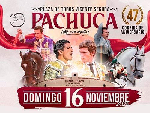 Los rejoneadores Fauro Aloi, Javier Funtanet, el grupo de Forcados de Pachuca y Amadores de México, los matadores Ernesto Javier "Calita" y Borja Jiménez, conforman el cartel por el 47 aniversario de la plaza "Vicente Segura", donde lidiarán un encierro de ocho toros de Montecristo.