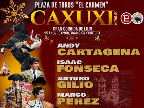El rejoneador Andy Cartagena, Isaac Fonseca, Arturo Gilio y Marco Pérez, conforman el cartel de la corrida que se realizará el domingo 21 de diciembre, en la plaza "El Carmen" de Caxuxi, donde lidiarán un encierro de ocho toros de la ganadería de Pablo Moreno, en el marco del 95 aniversario de arraigo taurino en este municipio hidalguense.