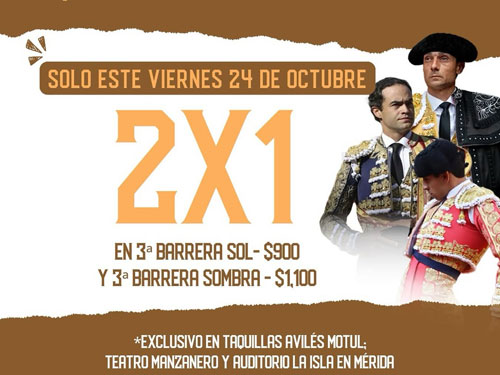 En apoyo a la Fiesta y a la economía de los aficionados, la empresa Toros Yucatán, ofrece la entrada al dos por uno, para las Barreras de tercera fila de Sol y Sombra, con costos de 900 y mil 100 pesos, respectivamente, en promoción válida exclusivamente para este viernes 24 de octubre.