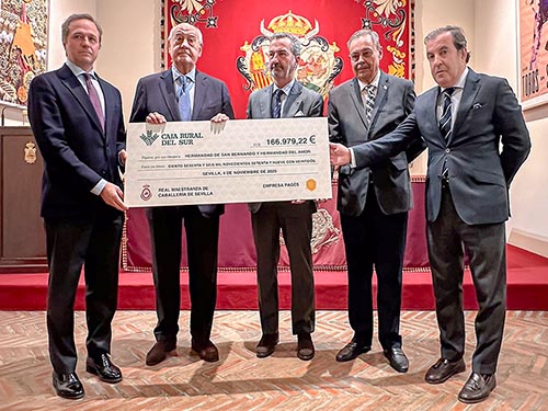 La Real Maestranza de Caballería de Sevilla y la Empresa Pagés han entregado este mediodía a las hermandades de San Bernardo y El Amor los beneficios del Festival taurino celebrado el pasado 13 de octubre en Sevilla en homenaje a la Dinastía de los Vázquez.
