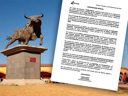 La empresa "Tore-Ando", a través de su directora administrativa Katya Arellano, emitió un comunicado donde anunció la cancelación de la corrida de Año Nuevo, en Apizaco, por causas de fuerza mayor y circunstancias imprevistas que imposibilitan material, técnica y jurídicamente la realización del evento.