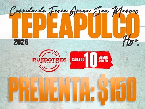 La empresa Feria anunció la preventa de boletos para la corrida del sábado 10 de enero en Tepeapulco, donde están anunciados el rejoneador André, Antonio García "El Chihuahua" y Sebastián Ibelles, que despacharán un encierro de seis toros de Gonzalo Iturbe, ganadería queretana con cimiente de Piedras Negras.