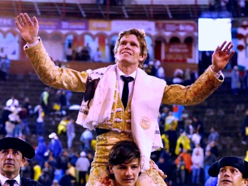 Para qué decir que la gente se rindió jaleando con la banda en la retaguardia. Por diestra y siniestra la faena matizada con capeínas, trincheras, giros regiomontanos, tuvo una verdad que justifico el alto tono emocional en la plaza. Tras tres molinetes en tanda, igualó y con seguridad ejecutó un volapié canónico y una estocada idem, letal, que le confirió las orejas del buen "Callado", acallando el mal ambiente que se había formado contra el encierro. Ovacionaron duro el arrastre y sacaron a hombros al tercer triunfador de una feria que hasta hoy transcurrido por la regla de tres: