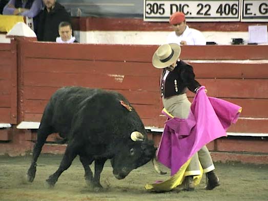 Ya, tras una hora, minuto más minuto menos, apareció el primer novillo de la noche. Seis verónicas, media y revolera iniciaron la lección titulada: "Cómo se lidia un manso". Viloria picó trasero y recibió un semitumbo. El quite por cuatro chicuelinas y larga cordobesa, pintado, pero no muy ligado por los sosos tardeos del ejemplar de Ernesto Gutiérrez.