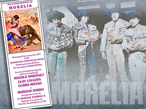 Mariano Ramos Narváez (Ciudad de México, 26–10–53), el más dominador y también el más adusto del cuarteto, enseñó una rara combinación de intuición y maestría desde que salió como novillero, tomó pronto la alternativa (Irapuato, 20-11-71), y por lo tanto había cumplido su primer lustro como matador cuando llegó esta tarde moreliana. Había impuesto su poderío en la Plaza México y aún no se aburría de ejercerlo como sucedería después. Para 1977 era una figura en plenitud.