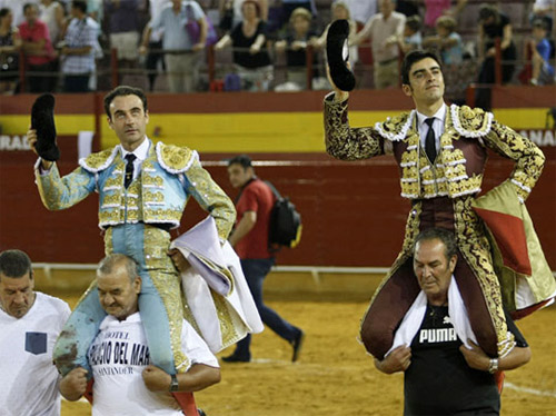 Los maestros Enrique Ponce y Miguel Ángel Perera compartieron la salida en volandas la tarde de este sábado en la ciudad española de Roquetas del Mar, Almería; el primero se llevó dos orejas, por cuatro del segundo, mientras que Talavante también tocó pelo.