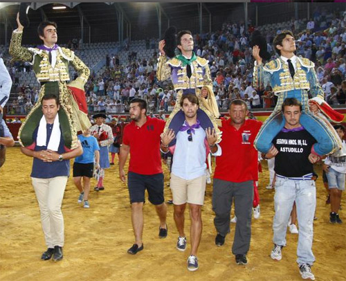 Triunfal tarde de toros la que se vivió la tarde de este sábado en la ciudad española de Palencia, dentro de la Feria de San Antolín, donde compartieron la salida por volandas los matadores Sebastián Castella, Miguel Ángel Perera y Juan del Álamo, ante un excelente encierro de Montalvo.