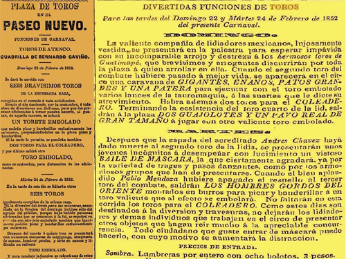 No podemos menos que tributar las más expresivas gracias a nuestro amigo el Sr. D. Javier Heras, quien a la menor insinuación nuestra nos ha proporcionado un arrogante toro de Guatimapé y LA ACREDITADA CUADRILLA DE LA PLAZA DE SAN PABLO (seguramente Andrés Chávez y Pablo Mendoza). Con el objeto de hacer más agradable y ameno el espectáculo, se permitirá a los señores aficionados que gusten entrar a lidiar el toro, que lo verifiquen presentándose en traje de máscara.