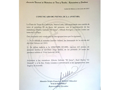 La Asociación Nacional de Matadores (ANMTNRyS) y la Unión Mexicana de Picadores y Banderilleros han emitido sendos comunicados para informar que la plaza de Cadereyta, Nuevo León, que dará una corrida el 18 de junio, se encuentra vetada por ambas agrupaciones.
