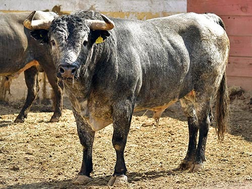 Número 124, "Catador", cárdeno, bragado, meano, delantero, vuelto y tocado del pitón izquierdo, con 470 kilos.