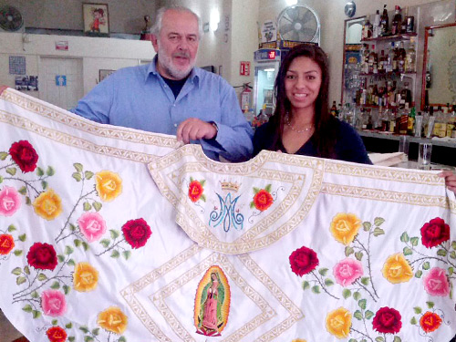 La entrega del capote de paseo, que está adornado con una imagen de la Virgen de Guadalupe, tuvo lugar hace un par de días en Apizaco, donde los ganaderos se reunieron con la torera poblana y su apoderado, Lázaro Rosas.