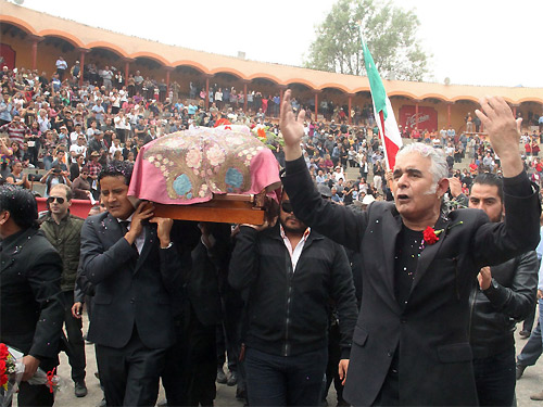 Al finalizar la misa, nuevamente con el acompañamiento de "Cielo Tlaxcalteca" recorrió el redondel dos veces a hombros de sus compañeros matadores, también subalternos y novilleros, que con lágrimas en los ojos manifestaban su pesar por ésta pérdida.