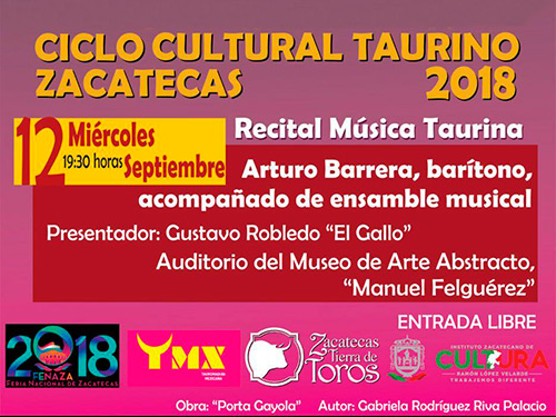 El recital de música de inspiración taurina estará a cargo del maestro barítono Arturo Barrera, que cuenta con una amplia experiencia como cantante de ópera. Estará acompañado de la joven promesa zacatecana Diana López de Lara, que es mezzosoprano.