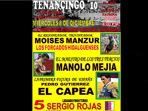 La empresa Promotora Sarajuana ha dado a conocer el cartel para la corrida del próximo 8 de diciembre en la localidad hidalguense de Tenancingo, festejo en el que se celebrarán los 80 años del coso "Alberto Balderas", localizado en el lugar donde, anteriormente, estaba ubicada la piscina "Leobar", la laberca del pueblo. Abrirá plaza el rejoneador Moisés Manzur, acompañado por los Forcados Hidalgenses, y a pie se verán las caras Manolo Mejía y Pedro Gutiérrez "El Capea".
